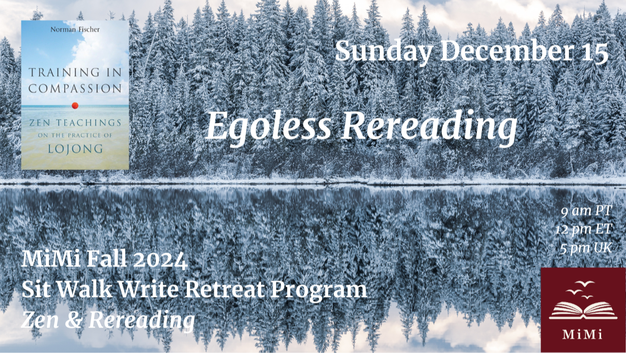 Finally, the END OF FALL Retreat, Egoless Rereading (SUNDAY DECEMBER 15), will leave Writing Down the Bones and Zen Mind, Beginner's Mind behind and study what is sometimes called "great compassion," the compassion built on the wisdom offered by a Buddhist view and having the power to not only make our writing but also our entire life meaningful: bodhicitta or the compassion generated by "the awakened mind."